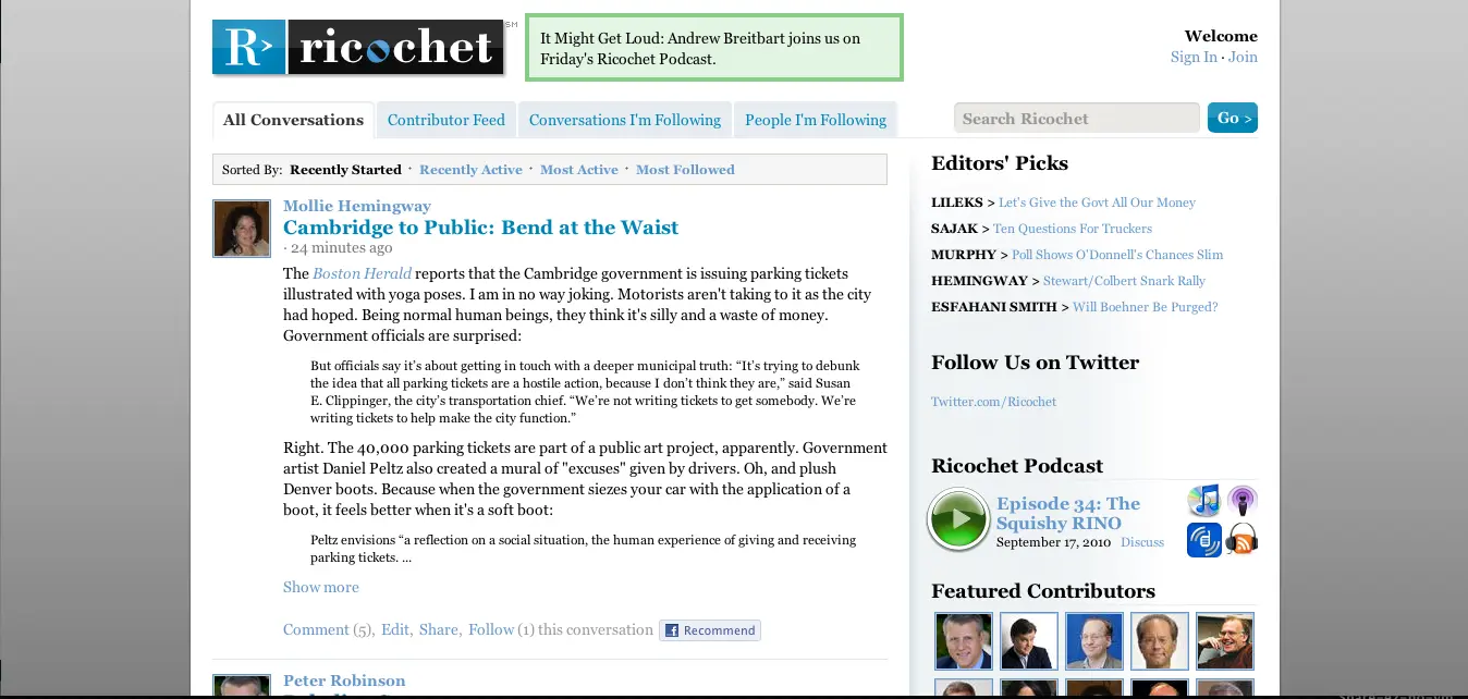 • The Contributor Feed. This is the backbone of Ricochet -- a non-stop, ongoing feed of our contributors' posts and comments. It's free for all to read, share, and link.